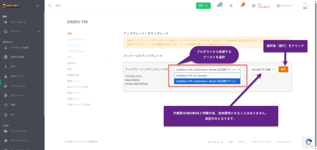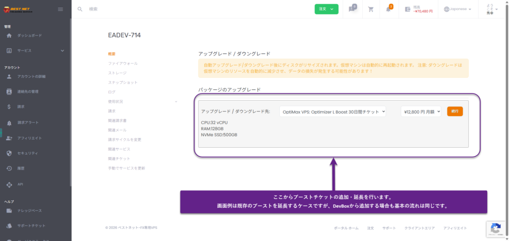 画面例は「7日 Boost から 30日 Boost へ延長するケース」ですが、