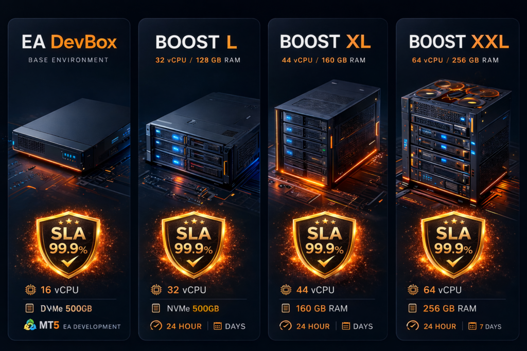 月額で開発環境を保持しながら、必要な時だけ高性能Boostを追加できるため、MT5 EA開発・最適化において「普段は抑えめ、必要な時だけ一気に回す」という使い方に向いています。料金も EA DevBox + Boostチケット という形で理解しやすく、Boost終了後は自動で通常構成へ戻るため、運用もシンプルです。さらに、24時間 / 7日 / 30日 の選択肢があるため、短期検証から継続利用まで柔軟に使い分けできます。